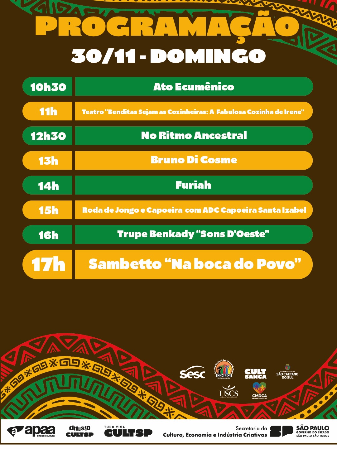 Na programação, shows musicais, encenações teatrais, maculelê, maracatu, roda de jongo, capoeira, aula aberta de samba rock.