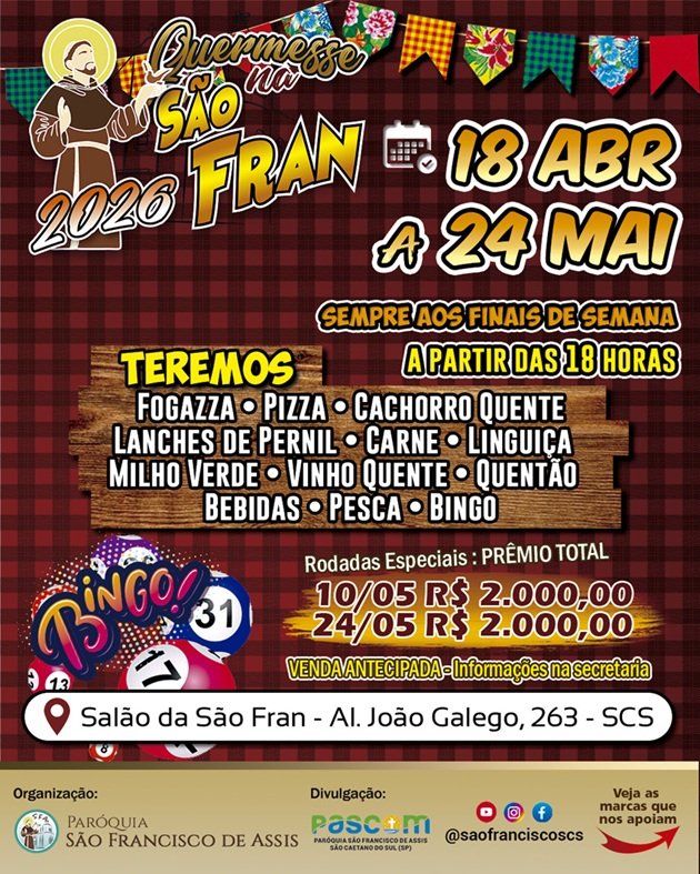 A tradicional Quermesse na Paróquia São Francisco de Assis em São Caetano do Sul começa neste sábado (18/04) às 18h e será realizada nos finais de semana, até o dia 24/05.