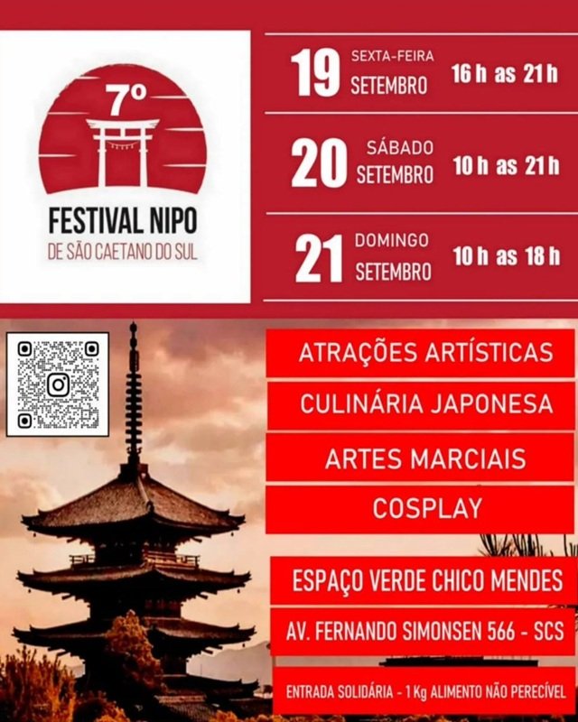 O evento será nos dias 19 (sexta-feira), das 16h às 21h; 20 (sábado), das 10h às 21h; e 21/9 (domingo), das 10h às 18h, com a realização da Associação Cultural Nipo Brasileira (Bunka SCS), e o apoio da Prefeitura de São Caetano do Sul por meio da Secretaria Municipal de Cultura.