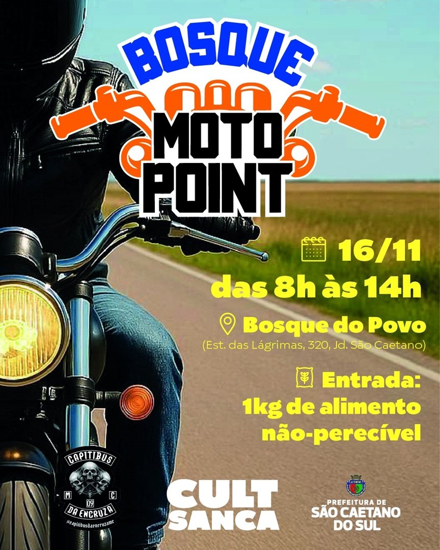 Dia 16 de novembro (domingo), das 8h às 14h, a Secretaria de Cultura de São Caetano do Sul realiza a primeira edição do Bosque Moto Point, no Bosque do Povo (Estrada das Lágrimas, 320, Jd. São Caetano).